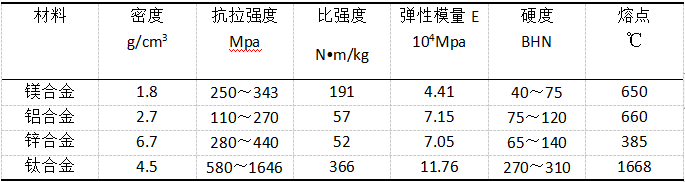 但就產(chǎn)品結(jié)構(gòu)設(shè)計而言,還需要考慮重量,如果將比重考慮進(jìn)去,鋅合金由于密度最大,比強(qiáng)度反而最小。鈦合金和鎂合金比強(qiáng)度高,但鈦合金價格昂貴,加工性能不好,因此在需要綜合考慮重量和強(qiáng)度的結(jié)構(gòu)件中,多采用鎂合金。